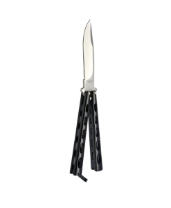 This Butterfly Knife is a sleek and durable folding knife featuring a handle that rotates around the blade’s pivot point. It typically has a stainless steel blade and handle, with intricate designs etched onto the handle for added style. The blade is sharp and designed for precision cutting, while the flipping action of the handle makes it popular among enthusiasts for tricks and manipulation. Overall, it’s known for its balance, craftsmanship, and versatility.