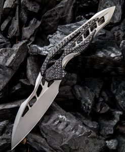 The flat grind blade ensures efficient slicing capabilities. The handle measures 4.55” (115 mm) in length and is made from 6AL4V titanium inlay with carbon fiber, offering a stylish and lightweight grip. The overall thickness of the handle is 0.55” (14 mm), providing a comfortable and secure hold during use.