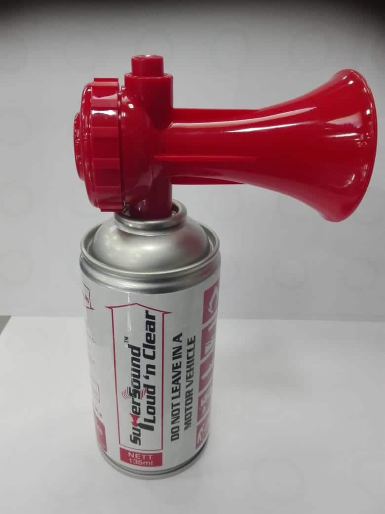 An air horn is a pneumatic device design to create an extremely loud noise for signaling purposes. It usually consists of a source which produces compressed air, which passes into a horn through a reed or diaphragm.