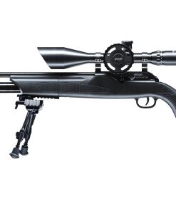 The gun comes with fiber optic front and rear sights. The fiberglass-reinforced synthetic stock has a Monte Carlo buttstock with cheekpieces on both sides. The textured forearm and pistol grip make it easy to have a firm grasp at all times. Included are: 300-bar-tank with manometer, second rotary clip, sound-moderator, Field-Target-ready scope 8-32 x 56 and bipod TMB II.