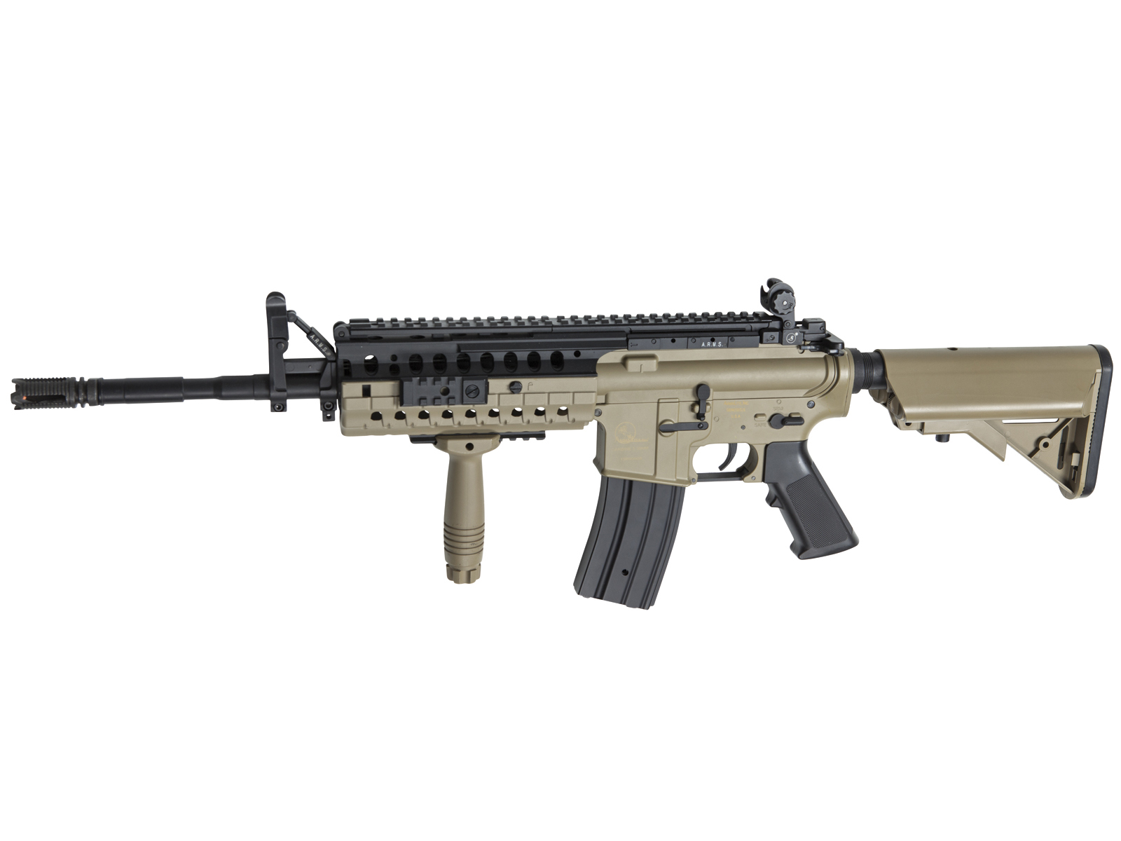 A Desert tan version of the Sportline Armalite M15 S.I.R. mod. 2. A massive looking yet remarkable lightweight S.I.R. system makes this a remarkable Airsoft gun. Made famous by US special forces, the S.I.R. system was one of the very first free float rail systems that allows a customized set-up of tactical accessories. The Sop-Mod butt-stock allows for easy acces to the battery compartment. This Sportline model features System & Flip-up sights fully licensed by A.R.M.S. Inc.