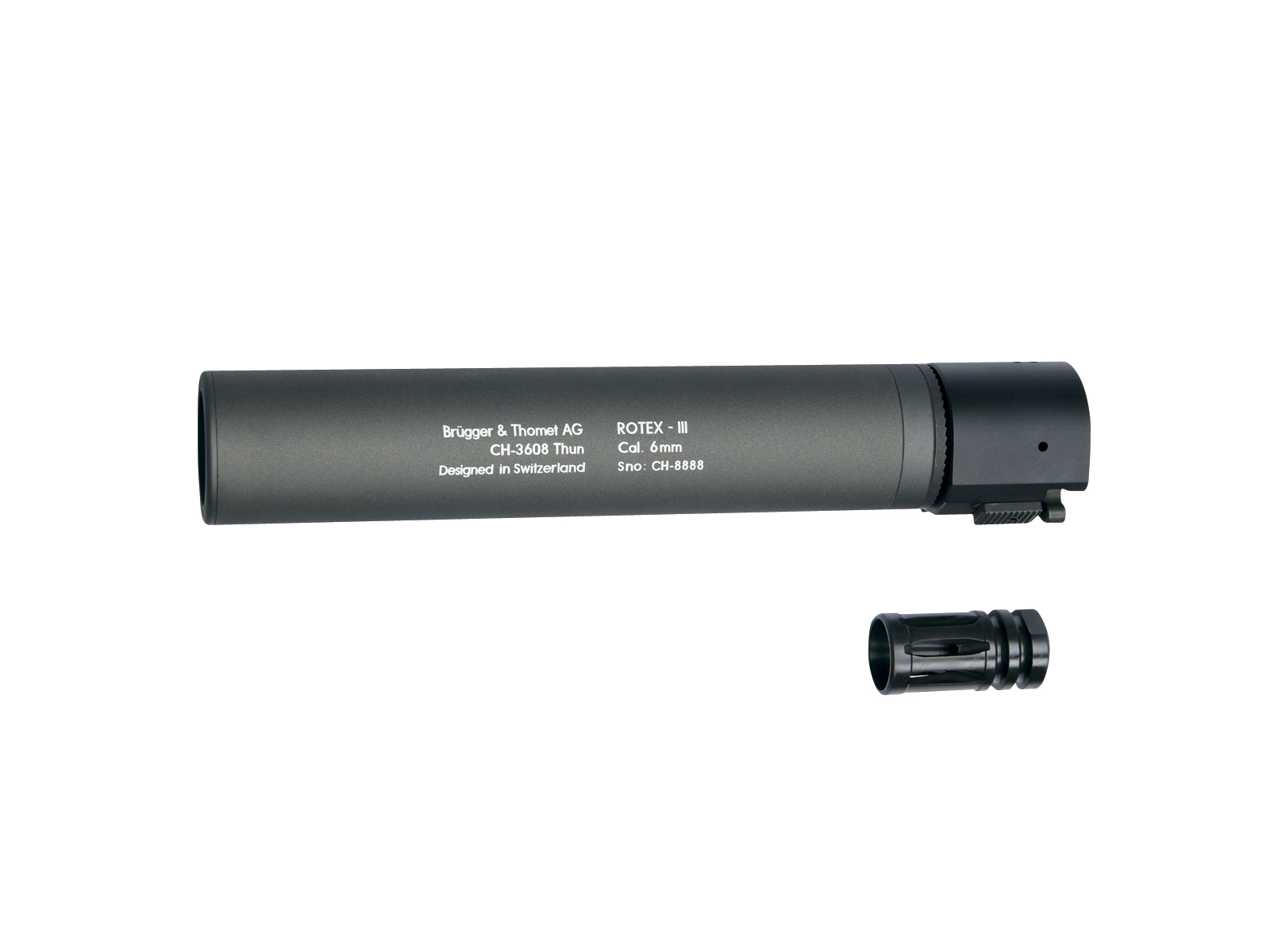 B&T barrel extension tube and flash-hider. Designed to appear as the ROTEX III silencer made by Brügge & Thomet AG (manufacturers of the famous MP5 a.o.), but made especially for Airsoft. With superior finish and materials this slimline barrel extension tube features a plunger type lock with a ratchet mechanism for a tight fit on the included flash-hider and is one of the best looking Airsoft “silencers” today. The inner barrel design ensures all shots exits the tube. The plunger lock allows a quick attachment on the flash-hider which features matching grooves and a counter-clockwise 14 mm internal thread, it can easily be screwed onto any barrel that features a matching thread.