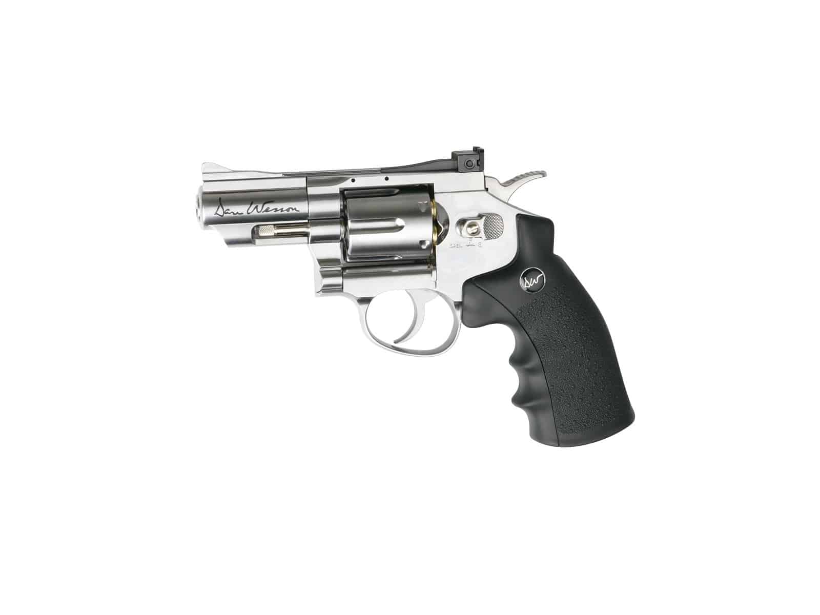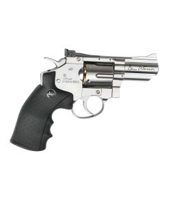 Compact and stylish ASG Dan Wesson 2,5 Silver 4.5MM. This 2.5” chrome revolver, licensed by Dan Wesson, offers realistic shooting fun in a handy size. It has authentic markings and an individual serial number stamped into the frame. The revolver features a double-action trigger system and adjustable rear sight for extra realism and accuracy. The Dan Wesson revolver is made of metal except for the ergonomic grip, constructed in hard ABS plastic.