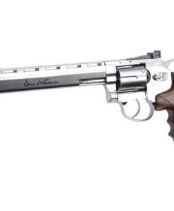 Demand attention with this powerful and impressive 8” Chrome revolver licensed by Dan Wesson. Made of metal with a silver shine finish featuring a wood style ergonomic grip constructed in hard ABS plastic. It has authentic markings and a individual serial number stamped into the frame. The revolver features a double action trigger system and adjustable rear sight for extra realism and accuracy. Each of the 6 cartridges holds one 4.5 mm BB and is placed in the metal cylinder that rotates as each round is fired. The 12g CO2 cartridge is stored in the grip and is easily accessed by sliding the grip back – easy-load style. The revolver comes with speed-loader, attachable tactical rail and 6 cartridges.