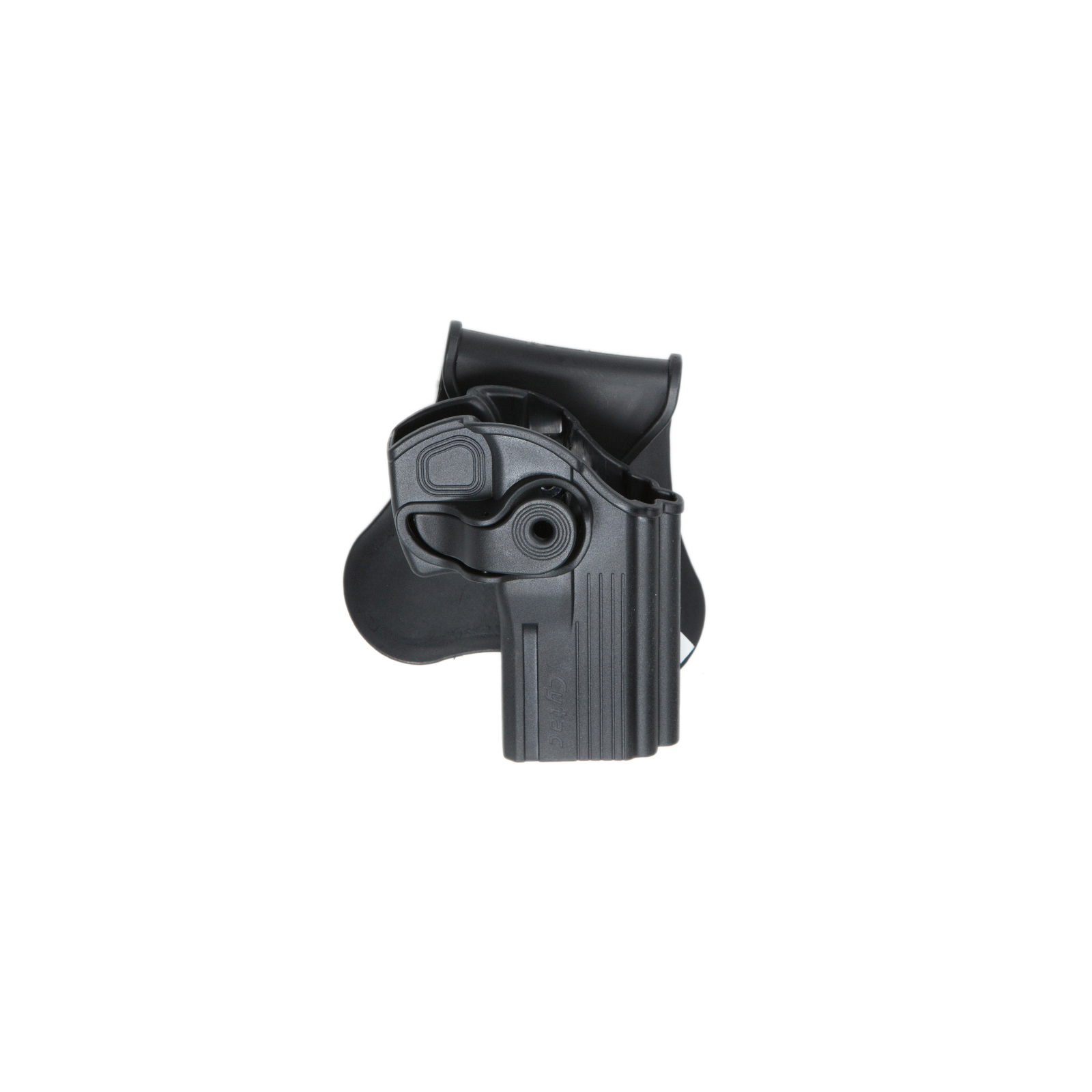With the large release/lock lever, the weapon sits firm and secured inside the holster for all demanding situations. The holster comes standard with a paddle mount for belts up to 42 mm width or pant waists allowing for concealed carry and features a rubberized back for comfort and better grip.