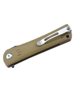 D2 is a high-quality tool steel known for its excellent wear and abrasion resistance. The smooth tan G10 scales of the knife are comfortable to hold, while the flipper tab makes blade deployment a breeze.