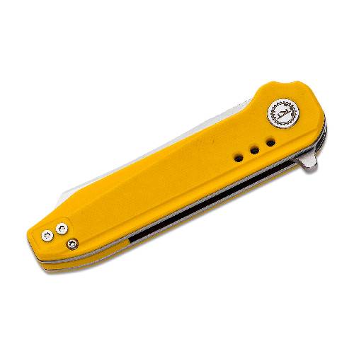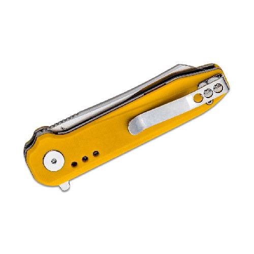 From the moment you hold the Syntax, its sleek profile and attention to detail stand out. The ergonomic handle scales, crafted from high-strength G10, are milled with strategically placed holes and a raised center ridge to ensure a secure grip—even when your hands are wet or slippery. The cheerful yellow color not only makes a bold statement but also ensures you can spot your favorite blade at a glance.