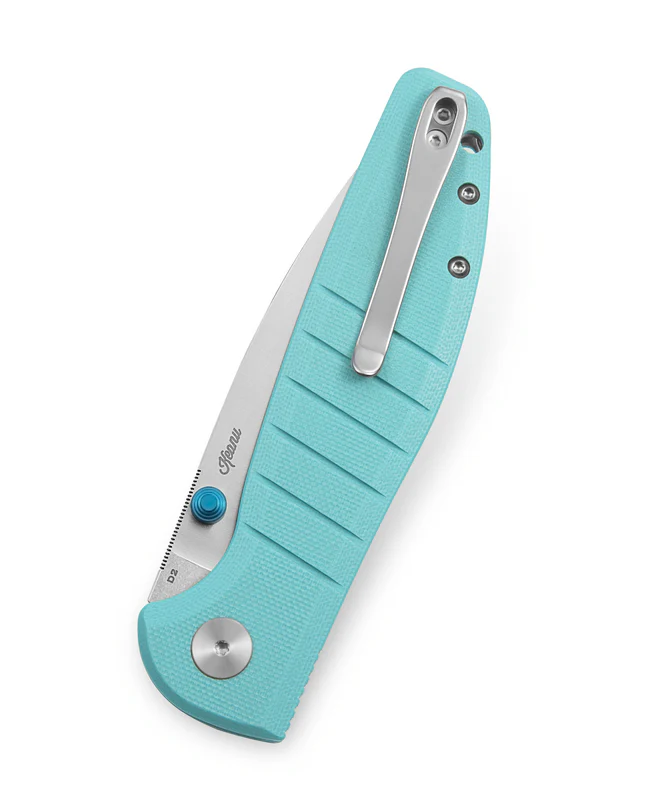 - Light Blue G10 Handle – Lightweight, waterproof, and textured for a confident grip