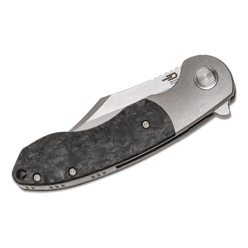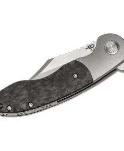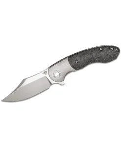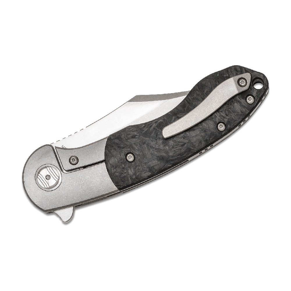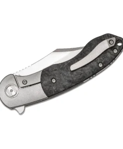The marbled carbon fiber handle with stonewashed titanium bolsters offers a blend of elegance and ergonomic comfort. The handle of this flipper knife provides a solid grip and ample leverage for any task. Complete with a titanium pocket clip, the BowieTie flipper knife makes for a reliable, eye-catching everyday carry.