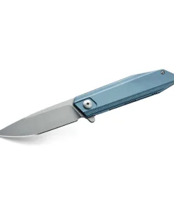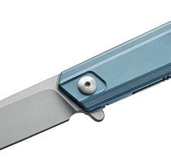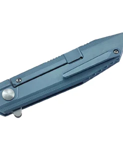 The knife rides on ceramic ball bearings, providing smooth operation, and the lockup is nice and tight for safety. The ergonomic handle is crafted from milled 6AL4V titanium with a striking blue finish, ensuring a comfortable and secure grip. The handle’s shape locks it into your hand, and the thumb ramp is perfectly executed for comfortable extended cutting tasks.