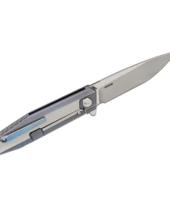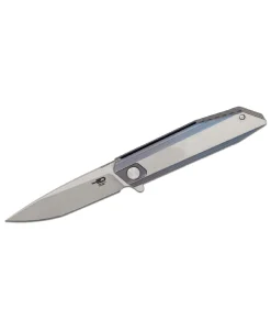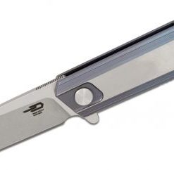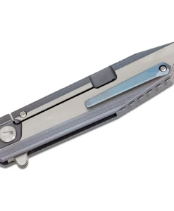 The action of the BT1701C Shogun Knife is remarkably smooth, thanks to the ceramic ball bearings that facilitate effortless deployment. The ergonomic handle is meticulously milled from 6AL4V titanium, showcasing a stunning blue finish complemented by silver titanium accents. This design ensures a secure grip, and the well-placed thumb ramp enhances comfort during extended cutting tasks.