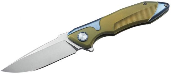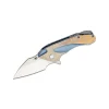 Designed for superior performance, the BT1709A Starfighter Knife rides on ceramic ball bearings, ensuring a buttery smooth action and a secure lockup. Its ergonomic, contoured handle is constructed from milled 6AL4V titanium, showcasing a bronze finish complemented by blue titanium accents. This design not only enhances grip security but also provides comfort during extended use, thanks to the perfectly executed thumb ramp.