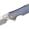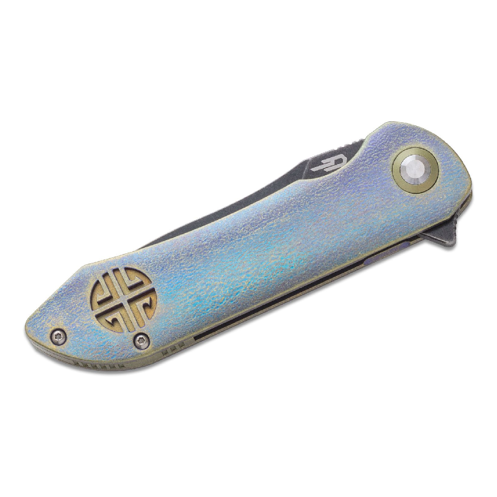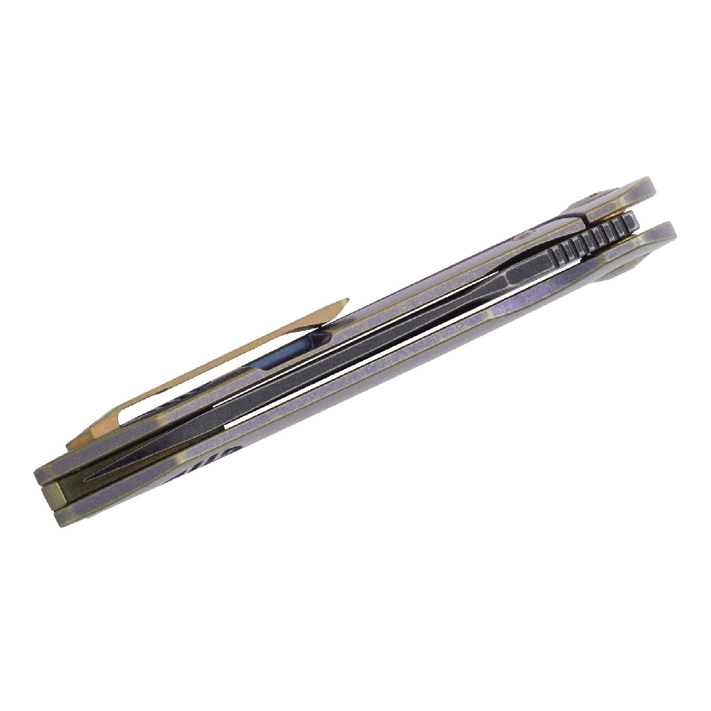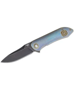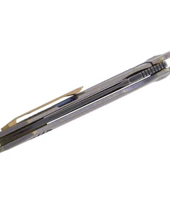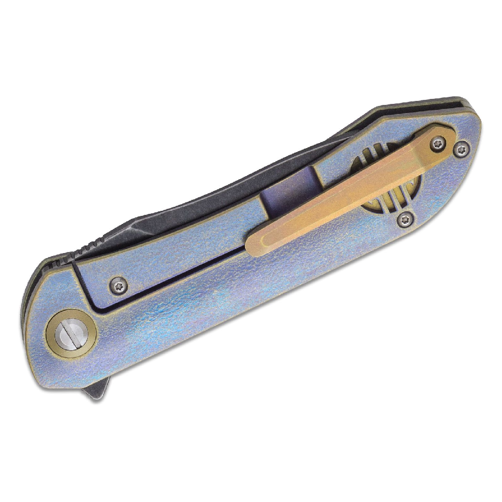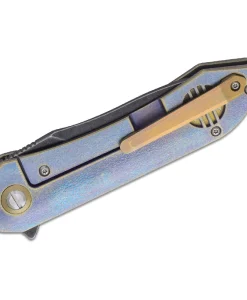 The ergonomic handle is constructed from milled blue 6AL4V titanium with gold accents, offering both a firm grip and a stylish appearance. The handle’s shape ensures comfort during extended cutting tasks, and the spine jimping provides additional traction for improved control. The pocket clip and backspacer, also made from 6AL4V titanium, guarantee maximum quality assurance.