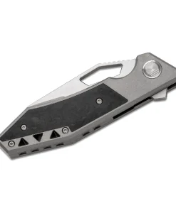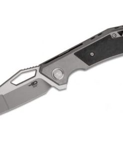 The blade deploys smoothly out of the handle thanks to the ceramic ball bearing construction in the pivots that BESTECH is known for. This innovative design is complemented by the angular look of the titanium handle, which showcases an attractive carbon fiber inlay and triangular cutouts near the bottom.