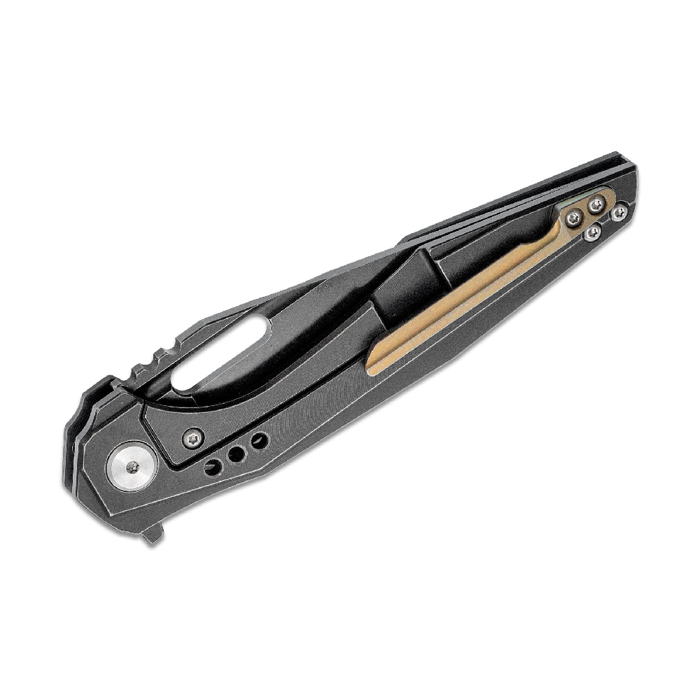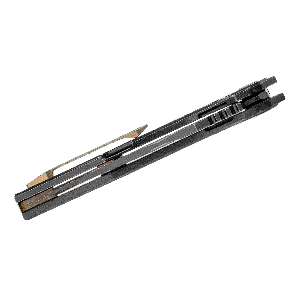 The handle scales of the BESTECH Knives Malware are made from titanium and carbon fiber, showcasing sharp bevels that offer a sturdy grip. The flipper tab, combined with ceramic ball bearings, ensures that blade deployment is smooth and effortless.