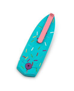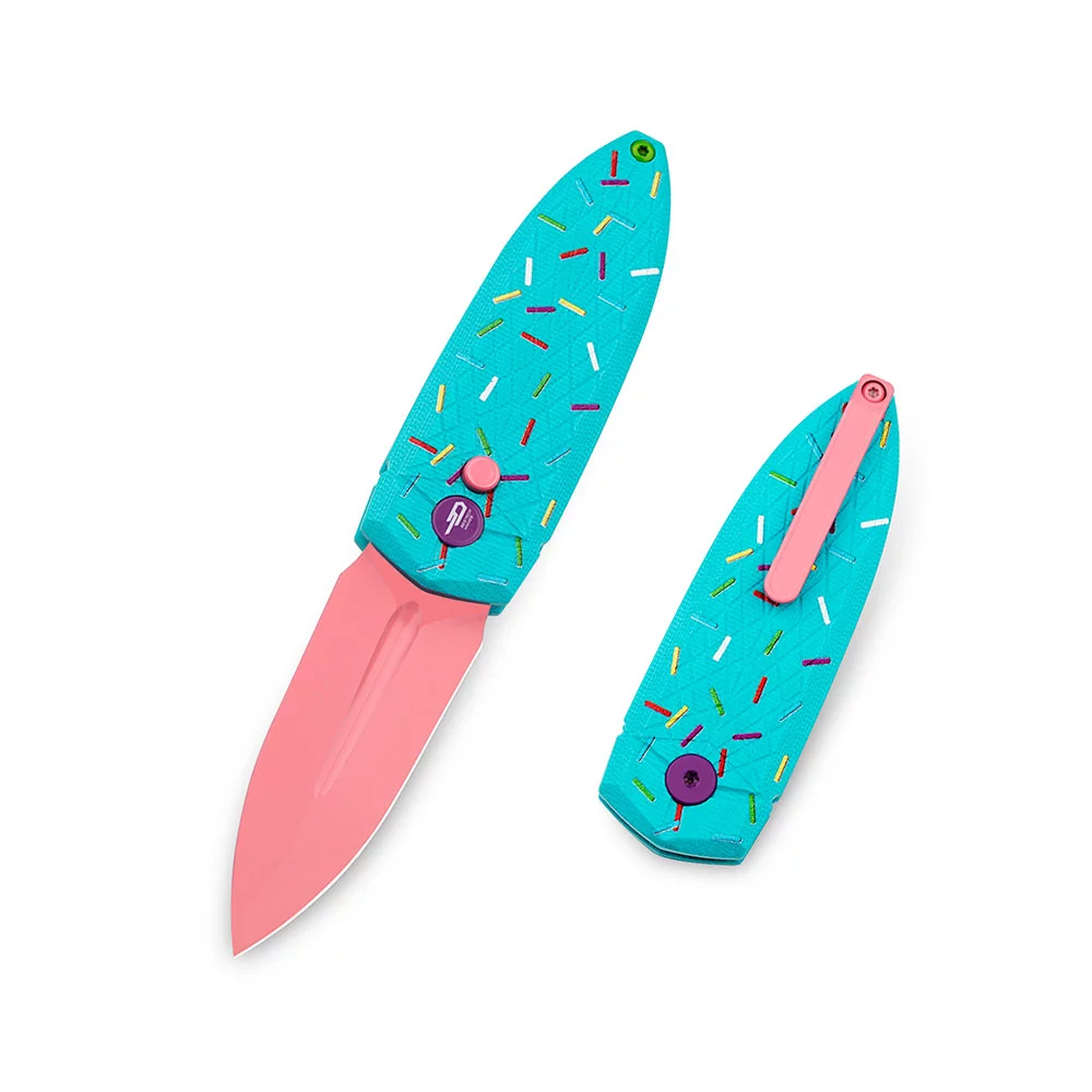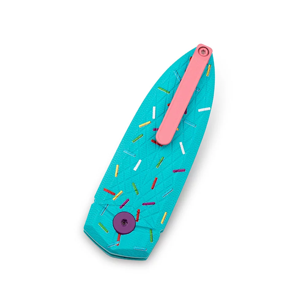 - Handle: G10 covers (blue, printed sprinkle pattern), steel fastening clip (one-sided, Tip-Up)