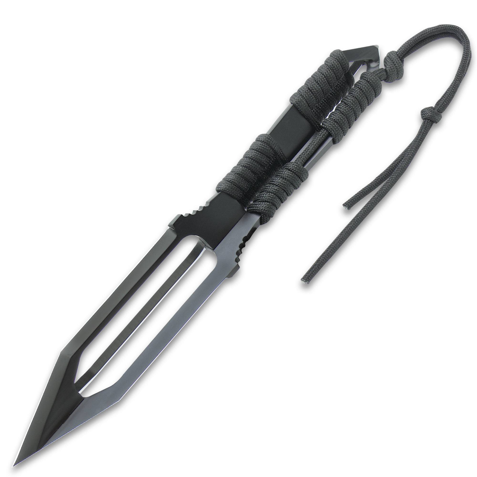 The Black Ronin Tri-Edged Spear Head is a handy survival tool that you’ll find plenty of use for when you’re out conquering the wild or as a valuable bugout bag addition! This open-design, tri-edged spearhead has a solid stainless steel construction with a black oxide coating and a penetrating point. The handle end is wrapped in plenty of black nylon paracord so that it can be lashed securely to any pole or sturdy stick. The 9” overall spear comes housed in a sturdy nylon belt sheath that will fit comfortably at your side ready to use.