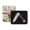 3 7/8″ closed. 2 1/2″ stainless drop point blade with thumb stud. Highly figured burl wood handles with finger grooves and stainless bolster. Comes in gift tin with Whitetail deer artwork. Hang packaged. Made in China