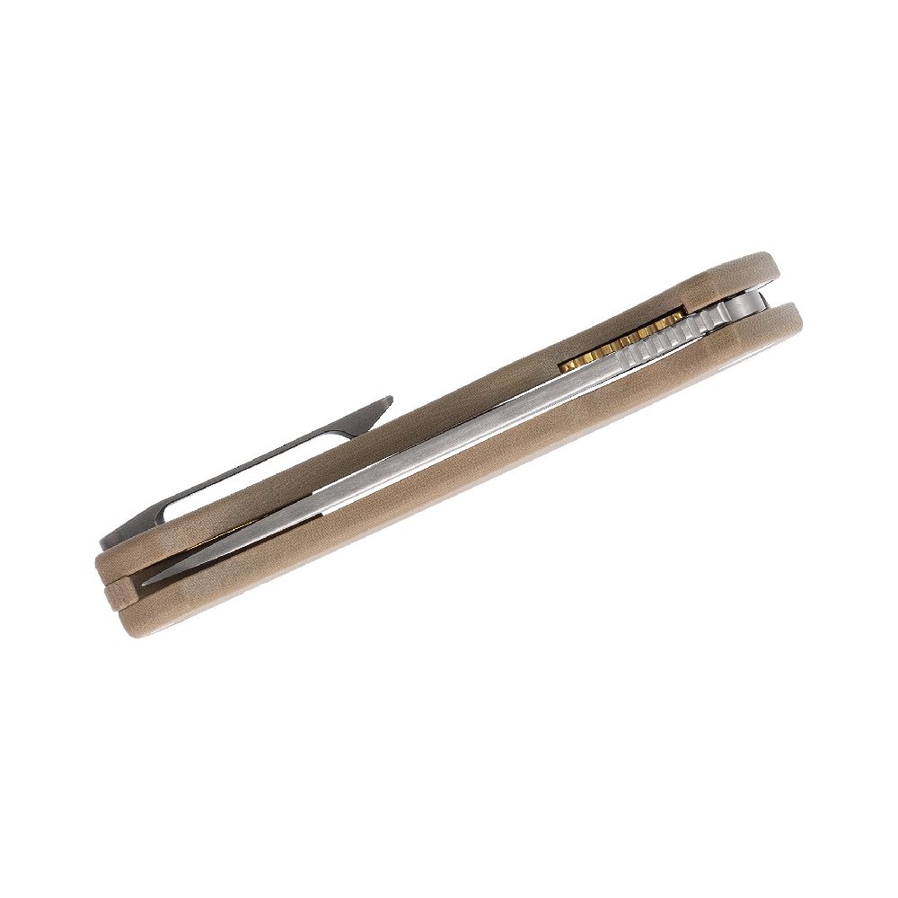 The Courser’s tan G10 handles are sculpted for a secure, ergonomic grip in any hand and any condition. Rain, sweat or gloves—this knife won’t slip. Beneath the robust scales, full stainless steel liners provide rock-solid stability and rock-steady lockup. When it’s time to pocket up, the reversible titanium clip rides low and discreet, making carry comfortable for right- or left-handers, tip-up only.
