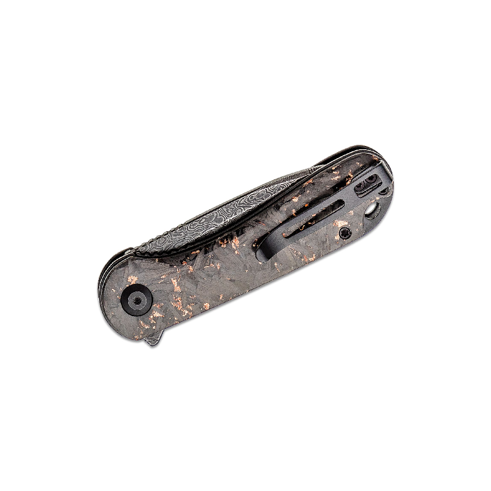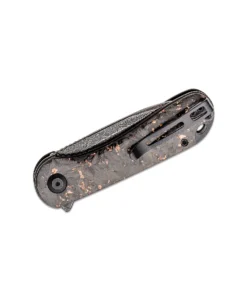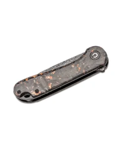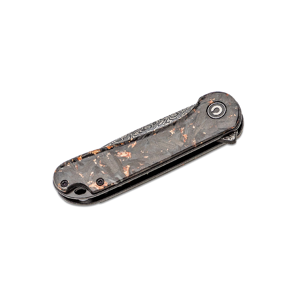 The Civivi Elementum is a modest, ergonomic, and functional knife. It features a black, hand-rubbed Damascus blade in a drop point shape with a contoured shredded carbon fiber handle with gold shred accents and a clear coat of resin. It has a flipper opener, a stainless steel liner lock mechanism, a tip-up, a right carry pocket clip, and a lanyard hole.
