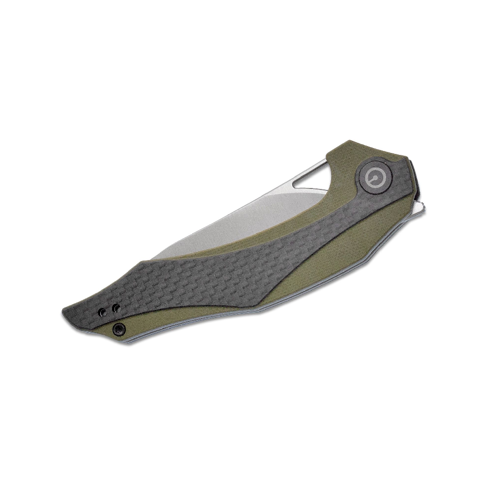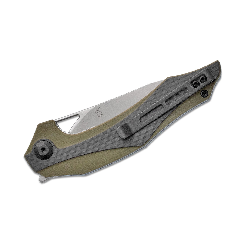 • Green G10 handle with carbon fiber inlays—durable, high-contrast style