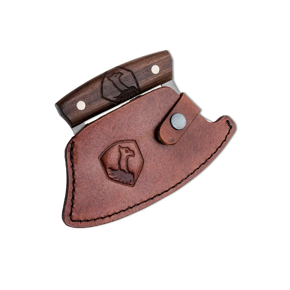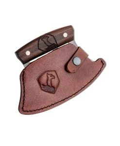 Packaged with a handcrafted welted leather sheath, this Ulu knife is always ready for action and safe to stow. The sheath’s secure snap closure keeps the blade protected and your gear organized, whether hanging from your belt on a wilderness expedition or tucked into a busy kitchen drawer.