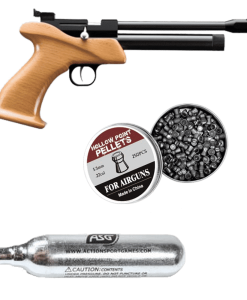 Pellet pistol uses 12g CO2 cartridge. Easy to load bolt action, single shot.Adjustable trigger & rear sight.