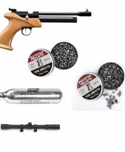 Pellet pistol uses 12g CO2 cartridge. Easy to load bolt action, single shot.Adjustable trigger & rear sight.