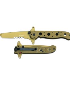 A unique series is designed for extreme desert environments, not only offering a combination razor-sharp ‘Veff’ serrations with an open build but also allowing two Carson flippers to be incorporated, resulting in a true hilt, a rarity in folding knives CRKT Desert Tan G-10 Knife.