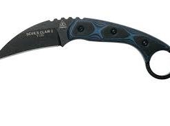 The Devil’s Claw 2 offers a longer and more effective update to the original TOP’s Devil Claw design. This model offers an extended karambit ring handle with black and blue layered G-10 handle scales. The blade is made from 1095 steel with a black traction coating. Add a clean karambit design to your arsenal with the TOPS Devil Claw 2.
