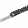 The Dirac Delta is Microtech’s larger version of the Dirac. Designed with an ergonomic chassis and curved lines similar to the H.A.L.O.. the Dirac Delta has a different feeling compared to their other handles. After researching this particular O.T.F. design, Microtech applied their signature ultra-high tolerance features such as proprietary hardware, innovative internal mechanism, and glass breaker.