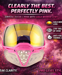 The Empire EVS Goggle System – Crystal Clear/Pink with Gold Mirror Lens delivers elite-level performance, clarity, and protection for serious paintball players. Engineered with a distortion-free spherical lens and premium dual-pane thermal technology, this mask provides an exceptional 270° field of vision while dramatically reducing fogging in intense play. Its tool-free quick-change lens system and moisture-wicking comfort foam make it perfect for competitive speedball or all-day scenario games. Built with ASTM-approved safety and enhanced breathability, the EVS combines cutting-edge design with pro-grade materials for top-tier protection, comfort, and style.