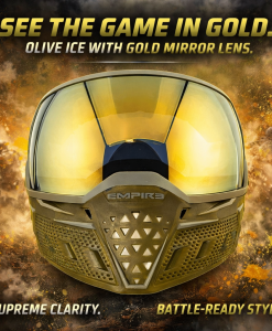 The Empire EVS Goggle – Clear / Olive Ice with Gold Mirror Lens delivers elite paintball vision and protection in a sleek, standout design. Featuring a wide-view distortion-free spherical thermal lens with a Gold Mirror finish, it provides an expansive 270° field of view and excellent glare control on bright fields. The dual-pane thermal technology significantly reduces fog buildup during intense play, while the tool-free quick-change lens system makes swapping lenses fast and easy. Built with ASTM-approved impact protection, moisture-wicking triple-density foam, and a secure silicone-backed strap, the EVS combines pro-grade performance, comfort, and durability for players of all levels.