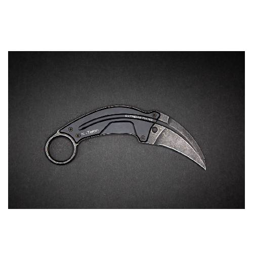 K-Talon is a fixed-blade karambit with a full-tang structure. It has a particularly thin shape with a thickness of only 10 mm including sheath and scales. The curved and hooked blade was inspired by the shape of a talon. It is designed to make clear and deep cuts as well as to hook, seize and/or tear. The ring in the back is built to gain a safe and firm grip in every situation. This way the knife does not slip and it makes it extremely difficult to disarm and point at the user.