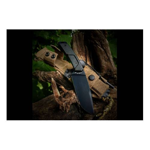 “EXTREMA RATIO SETHLANS” is a fixed blade work knife born to face a wide range of situations, suitable for survival, bushcraft, prepping, but also as a backup blade. SETHLANS was designed in collaboration with Daniele Dal Canto, Master Advanced Instructor. SETHLANS is available in two different versions with two different kinds of steel. The stone washed version is produced with böhler N690 heat treated at 58 HRC, chosen for the reliability it has demonstrated over the last 20 years due to its resistance to oxidation and durability of the edge. The black version is produced in D2 steel, heat and cryogenically treated at 60 HRC, which presents an high resharpening capacity even with makeshift tools. In order to give greater qualities of hardness and resistance, the blade is coated with the new Teflon-based product “EXP DARK”, proposed by Extrema Ratio. The knife comes with G10 grips that feature the ergonomic design characteristic of Extrema Ratio handles. They can be removed by releasing the skeletonized structure of the knife, that allows maximum lightness with minimum thickness. For lovers of extreme customization, the full-tang structure allows the handle to be covered with a paracord cord. The sheath is composed of a part in very light and minimalist Kydex. It can be disassembled and can be adapted for both left and right handed users. The addition of an optional belt clip allows the knife to be positioned both vertically and horizontally and makes the sheath much more versatile than the textile version. It is also equipped with a mini pouch with M.O.L.L.E. system. containing a two-sided stone for sharpening and a Firesteel for lighting fires”.