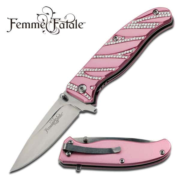 The FEMME FATALE FF-A001PK Spring Assisted Knife combines style and functionality in a compact, elegant design. With a satin stainless steel blade and a rhinestone-adorned pink aluminum handle, this knife is both fashionable and practical for everyday carry. The FEMME FATALE FF-A001PK Spring Assisted Knife features a 2.75″ satin blade, pink aluminum handle with rhinestones, and a pocket clip for easy carry.