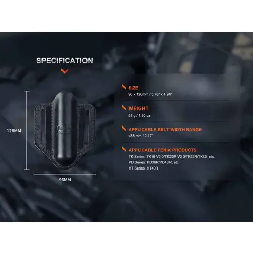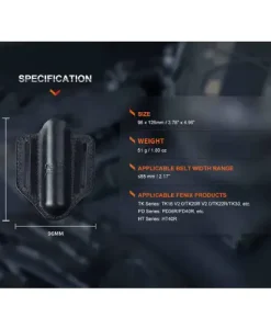Designed with practicality in mind, the Fenix ALP-20 holster features sturdy belt loops that accommodate belts up to 2.17 inches wide, ensuring that your flashlight remains firmly attached and ready for use. The holster’s dimensions, 3.78 inches in width and 4.96 inches in height, are compact enough for everyday carry without compromising on utility. Weighing just 1.80 ounces, it adds minimal bulk while providing essential protection and quick access to your flashlight.