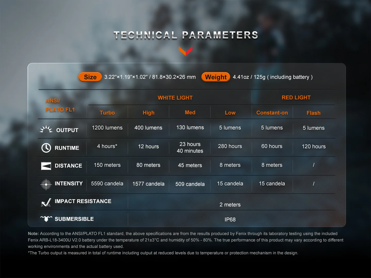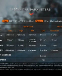 1200 lumens maximum output and 150 meters maximum beam distance.