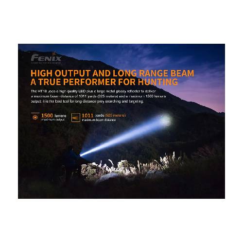 Meet the Fenix HT18 LED Flashlight, your stealthy ally for every early-morning stalk, late-night trek or far-reaching search. Despite packing a punch of up to 1,500 lumens, this compact powerhouse measures just 7.2 inches long, slips easily into a pack or holster, and weighs a mere 7.8 ounces (without battery). Its razor-sharp beam reaches an incredible 3,035 feet (925 meters)—that’s over half a mile—to spotlight distant game, landmarks or trail markers with laser-like precision.