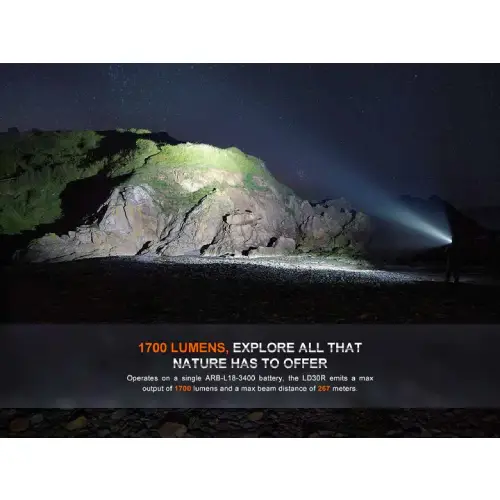 The Fenix LD30R Rechargeable Flashlight is a powerful everyday carry flashlight with a maximum output of 1700 lumens. Activate it with the tactical tail switch and cycle through seven lighting modes using the side switch. USB Type-C rechargeable with a battery level indicator ensures your flashlight is always ready. Its two-position body clip offers convenient carry options. Built with durable IP68-rated waterproof and dustproof materials, this flashlight is designed to perform in all conditions.