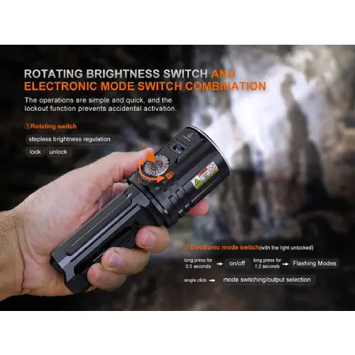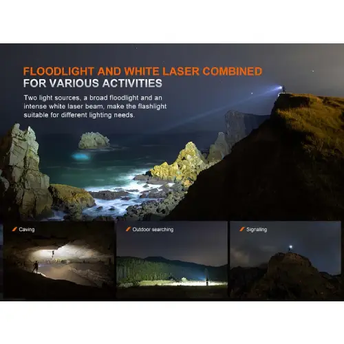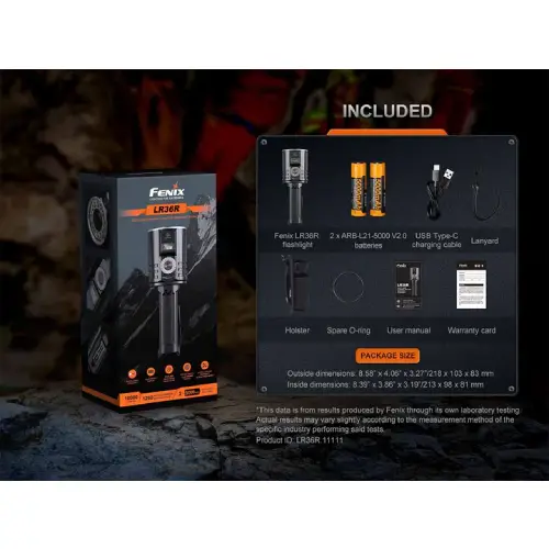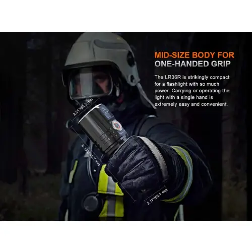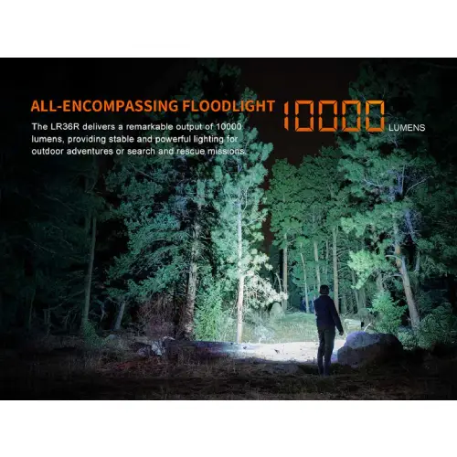 The Fenix LR36R is a powerful flashlight that combines a 10,000-lumen floodlight and a white laser into one versatile tool. Its white laser beam reaches an impressive 4133 feet (1260 meters), while the floodlight ensures wide-area illumination. The OLED smart display keeps you informed with real-time updates on your settings, and the rotating dial offers precise, stepless brightness control. With five modes—Floodlight, Laser, Floodlight + Laser, Strobe, and SOS—you’ll always have the right lighting at your fingertips. Powered by dual 21700 rechargeable Li-ion batteries, the Fenix LR36R delivers up to 102 hours of runtime. With the Fenix LR36R, you get the perfect combination of power, precision, and reliability in one flashlight.