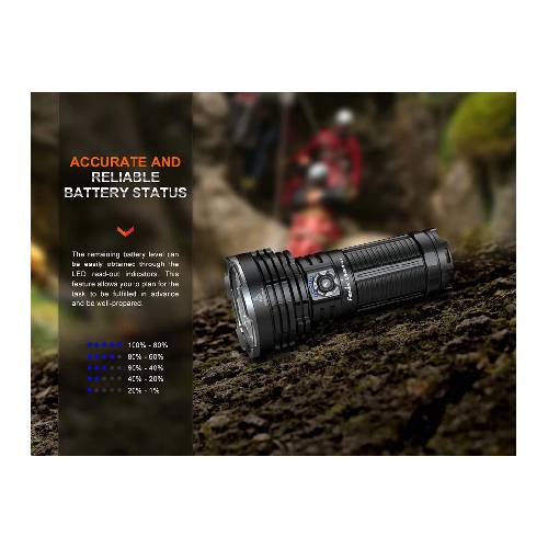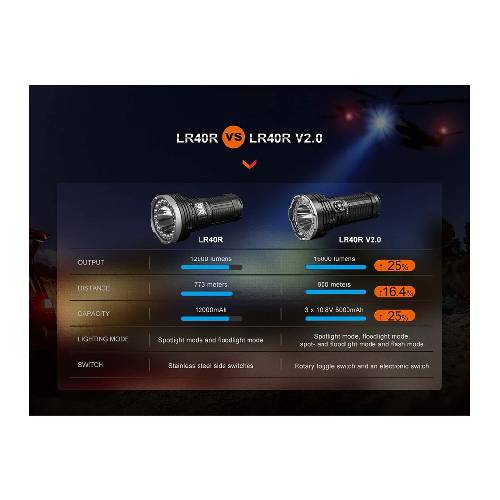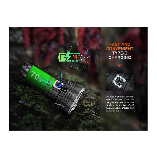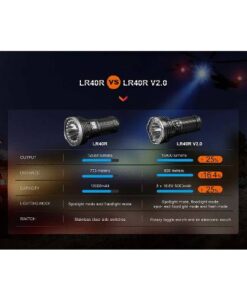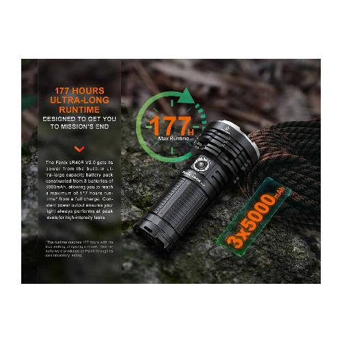 The Fenix LR40R V2.0 Search Flashlight is high-performing and rechargeable, combining a spotlight and floodlight to blast a maximum output of 15,000 lumens up to almost 1,000 yards. Quickly charge this flashlight’s built-in battery pack in as little as 4 hours via the USB Type-C port, or use the discharge function to charge your other devices. Its unique rotating switch, along with its push-button switch, allows you to access 16 lighting modes. Choose spotlight, floodlight, or both. Powerful light for any situation makes this flashlight the perfect tool for search and rescue.