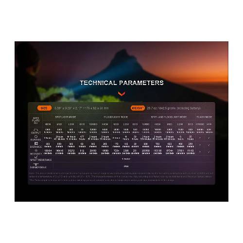 - Lighting Modes: 16 modes, including 4 spotlight levels, 5 floodlight levels, 5 combo levels, strobe, and SOS