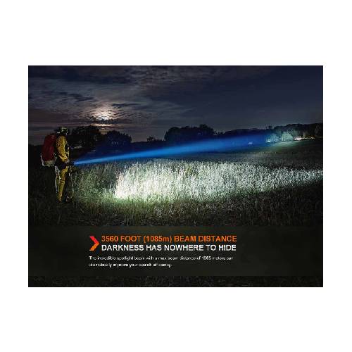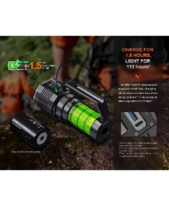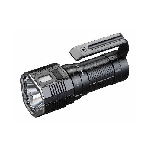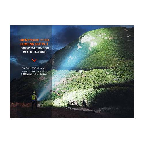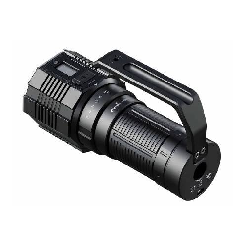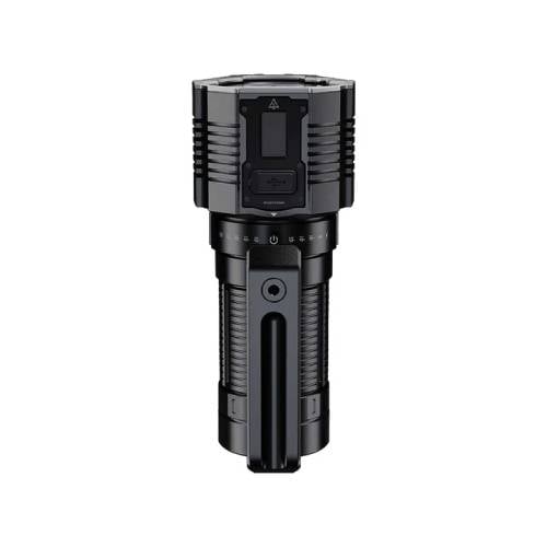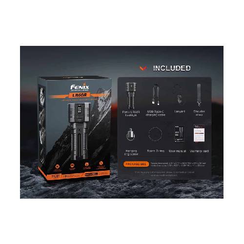 The Fenix LR60R search flashlight is an advanced flashlight built for performance. It uses its rotary switch to choose between 10 lighting modes—the floodlight for a wide field of view, the spotlight for long distances, or both for a highly bright 21000 lumens of light. An OLED display shows you which mode you are in and the remaining runtime. Quickly charge this flashlight’s replaceable battery pack in as little as an hour and a half via the USB Type-C port, or use the discharge function to charge your other devices. Included is a tripod socket and shoulder strap used for hands-free lighting. A powerful light built for the pros makes this flashlight the ultimate tool for exploring, searching, and rescuing.