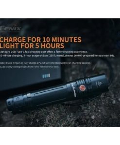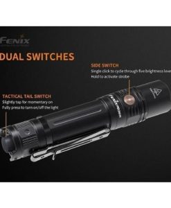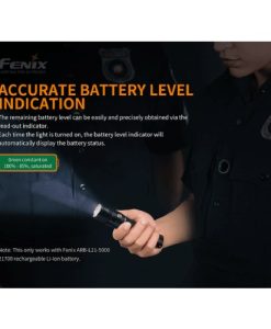 A quick tap of the PD36R’s rear tactical switch will instantly activate the flashlight, while a full press will leave the light on. Need more power? No need to worry; Fenix has integrated an all-new ARB-L21-5000 mAh rechargeable battery with the Fenix PD36R, which lasts longer than the typical 18650 battery. This new battery can be quickly charged with the included USB Type-C charging cable that plugs directly into the flashlight’s charging port. Battery status can be seen on the flashlight’s side switch, which lets you know when it’s time to charge.