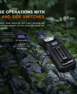 Front white light switch and side UV light switch for on/off function, output selection and mode switching.