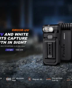 The included body clip provides secure attachment to your pocket, hat brim, or backpack strap. With all these features and an IPX6 waterproof rating, the Fenix SW05R-UV is an ideal lighting choice for law enforcement operations and document authentication.
