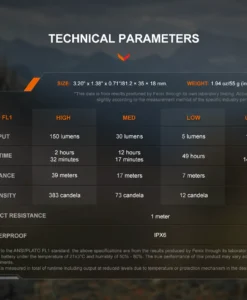 150 lumens maximum output, 39 meters maximum beam distance.