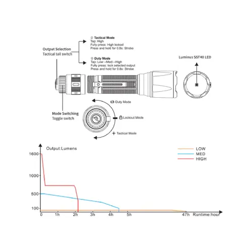 - Luminus SST40 LED with a lifespan of 50,000 hours.