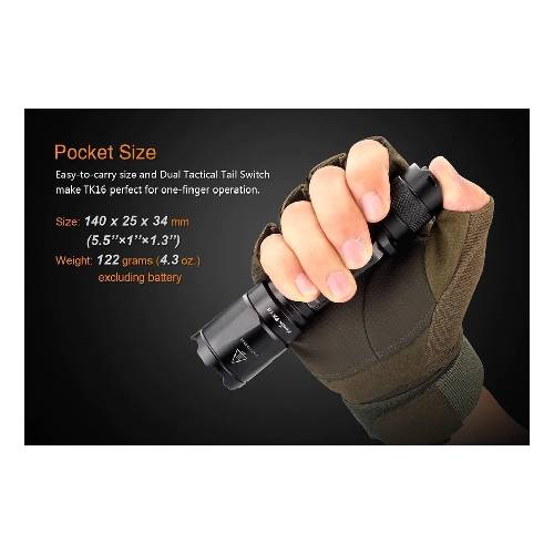The Fenix TK16 Flashlight is a top-tier tactical flashlight designed for demanding conditions. This powerful flashlight features advanced controls, including a Dual Tactical Tail Switch for efficient one-finger operation, providing quick access to both strobe and momentary modes.